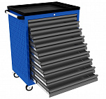 Тележка инструментальная модернизированная комплектуется 9 выдвижными ящиками с поворотными колесами. Тележка изготовлена высотой 950 мм. Грузоподъемность ящиков до 30 кг. Общая нагрузка на тележку до 220 кг. Размеры (ВхШхГ) 950x660x470 мм. Вес: 57,5 кг.