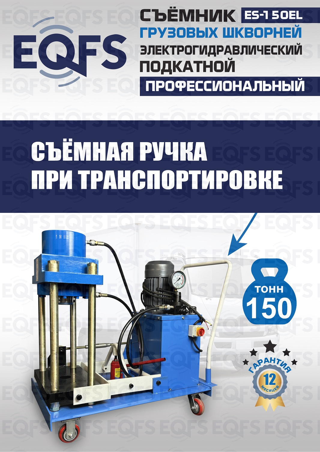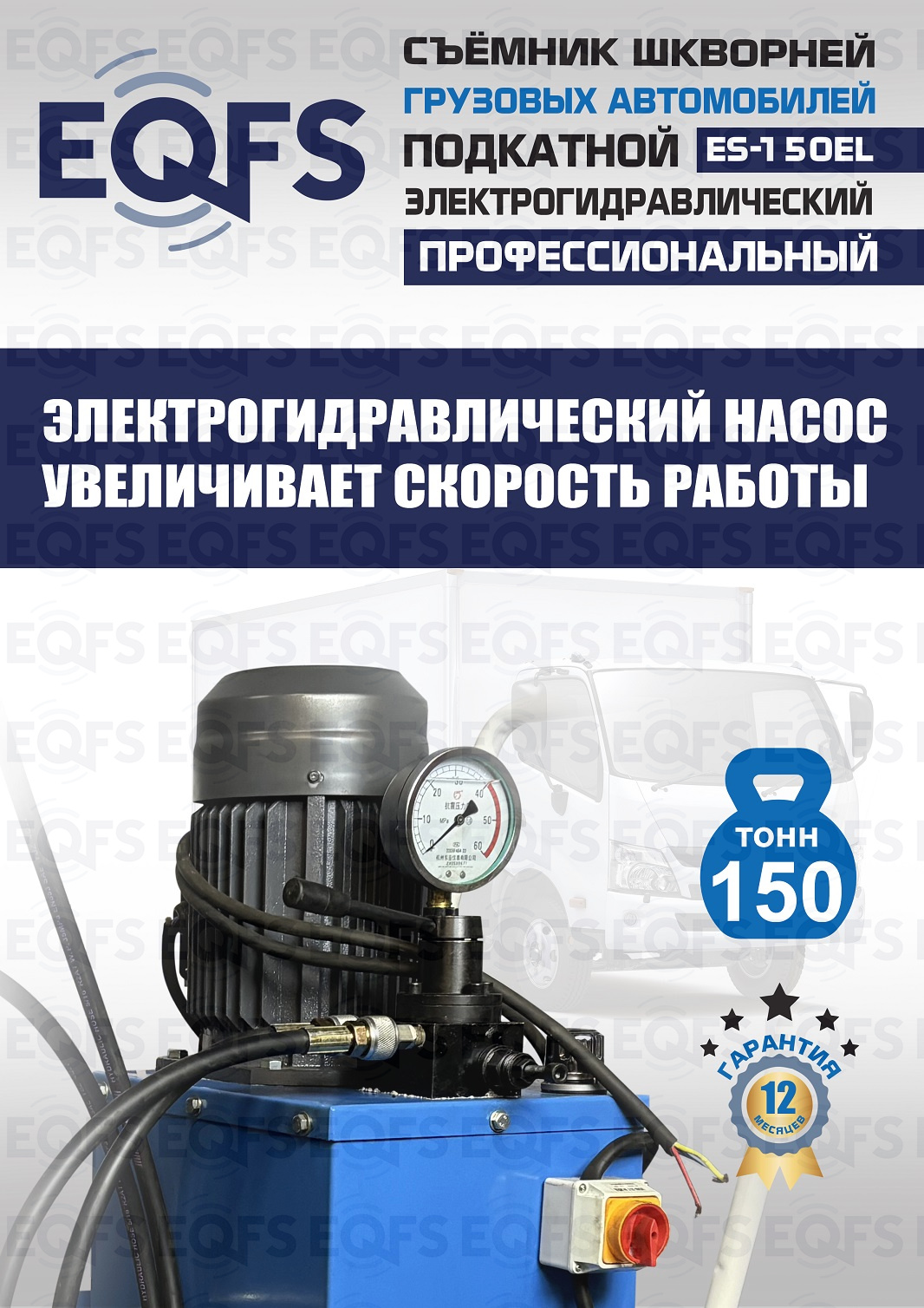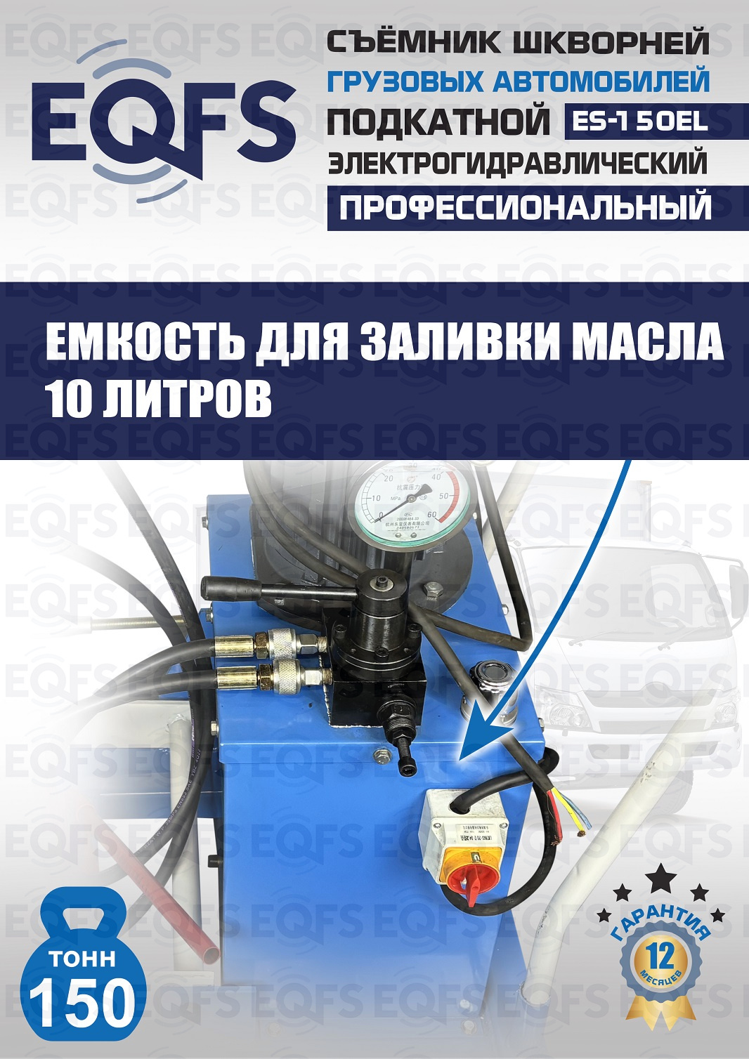 Сокращает время ремонта. Позволяет работать под разными углами 1 человеку. Мобильный. Для выпрессовки шкворней из поворотной цапфы погрузчиков, тракторов, строительной техники, коммерческих и грузовых авто отечественного и импортного производства: MAN, MERCEDES, SCANIA, VOLVO, Корейские и Китайские авто. Электрогидравлический привод. Рабочее окно 400x320 мм. Усилие 150 тонн.