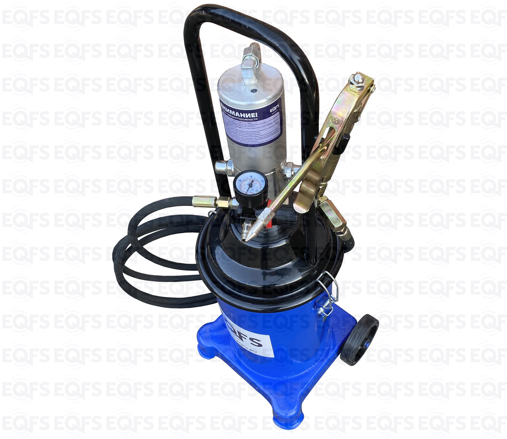 Пневматический. На колесах. Продавливает «ЗАБИТЫЕ» тавотницы. Давление смазки 300-400 Атм. Пистолет с наконечником производительность 850 г/мин. Для шприцевания шарнирных соединений (тавотниц, крестовин, подшипников, цепей). Заправка смазкой из ведра, тубы, бочки. Высота бака 320 мм. Диаметр бака Ø 220 мм. Длина шланга 4 м. Емкость бака 12 кг.