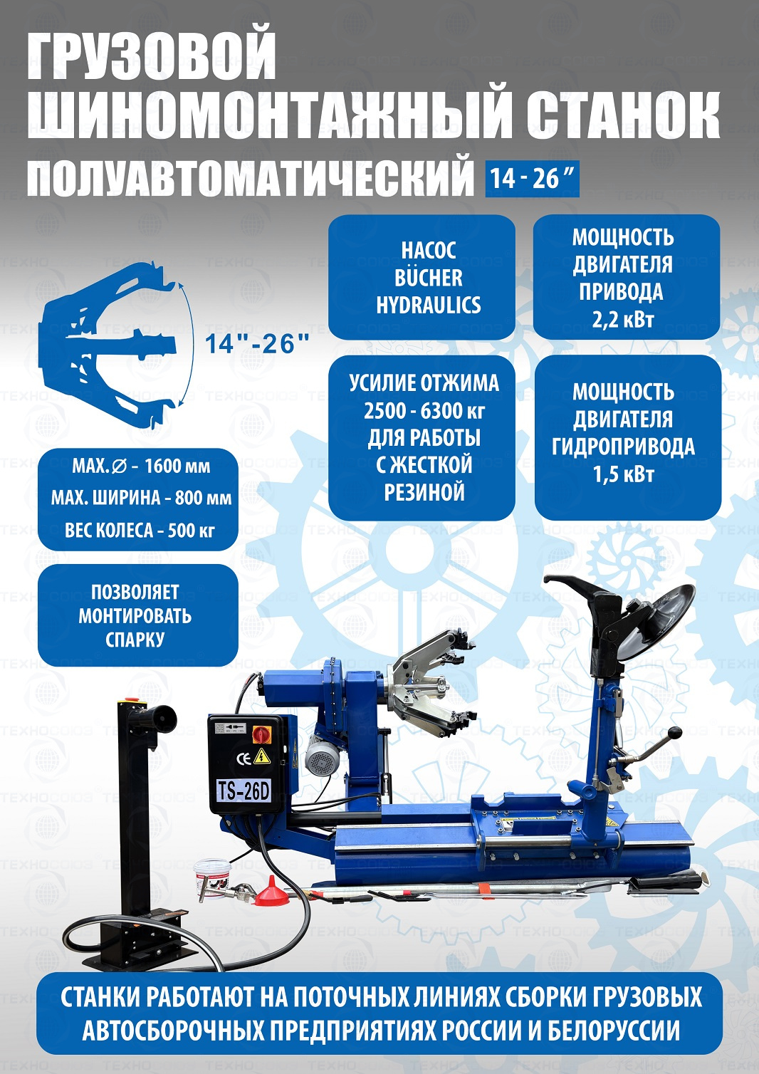 полуавтоматического грузового шиномонтажного станка TS-26D. Отказов и рекламаций нет!!! Диски сталь, AL, с кольцами и без, 14÷26” с адаптерами 14÷42”, Колесо макс. Ø1600 ширина 780мм, до 500кг. Моторы 1,5 + 2,2кВт. Гидравлика – немецкая «BUCHER HIDRAULICS». Гарантия до 18мес.