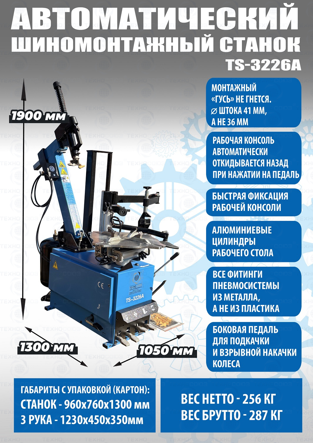 автоматического шиномонтажного станка TS-3226А предназначен для монтажа и демонтажа колес легковых автомобилей, легких грузовиков, не больших автобусов и коммерческой техники. Для дисков: 11÷24”. В комплекте: полноценная 3-я рука для работы с жесткой и низкопрофильной резиной RUNFLAT. + встроенный бустер 24 литра (взрывная подкачка) + пистолет для подкачки шин + монтажка + регулятор давления с влагоотделителем и манометром.