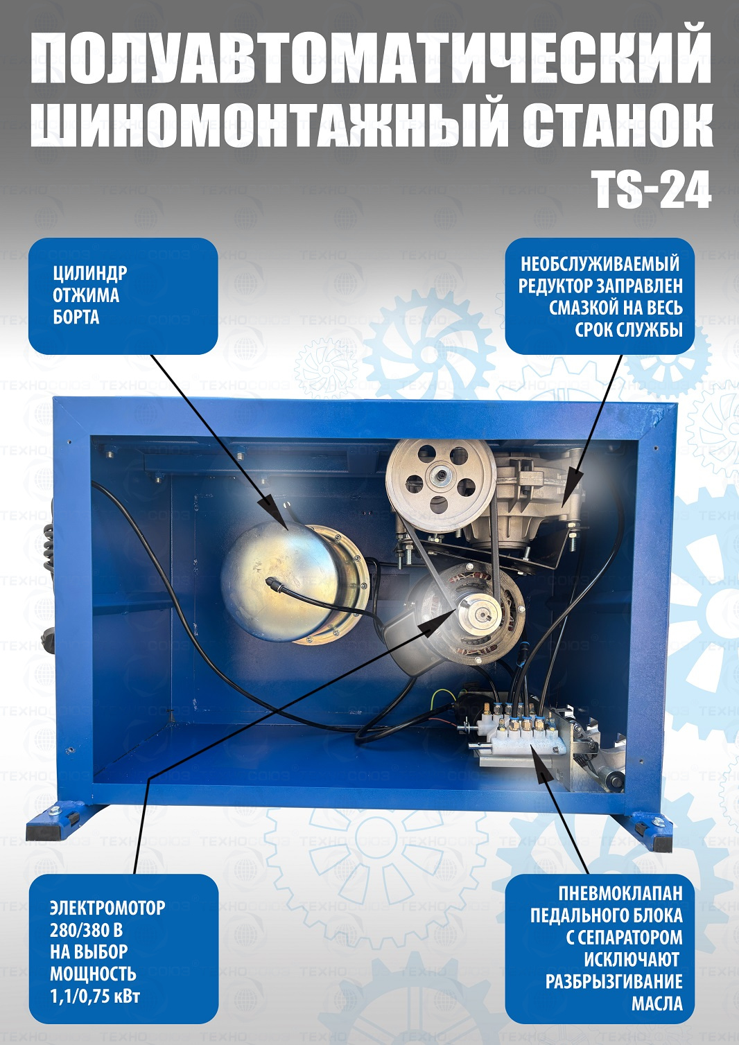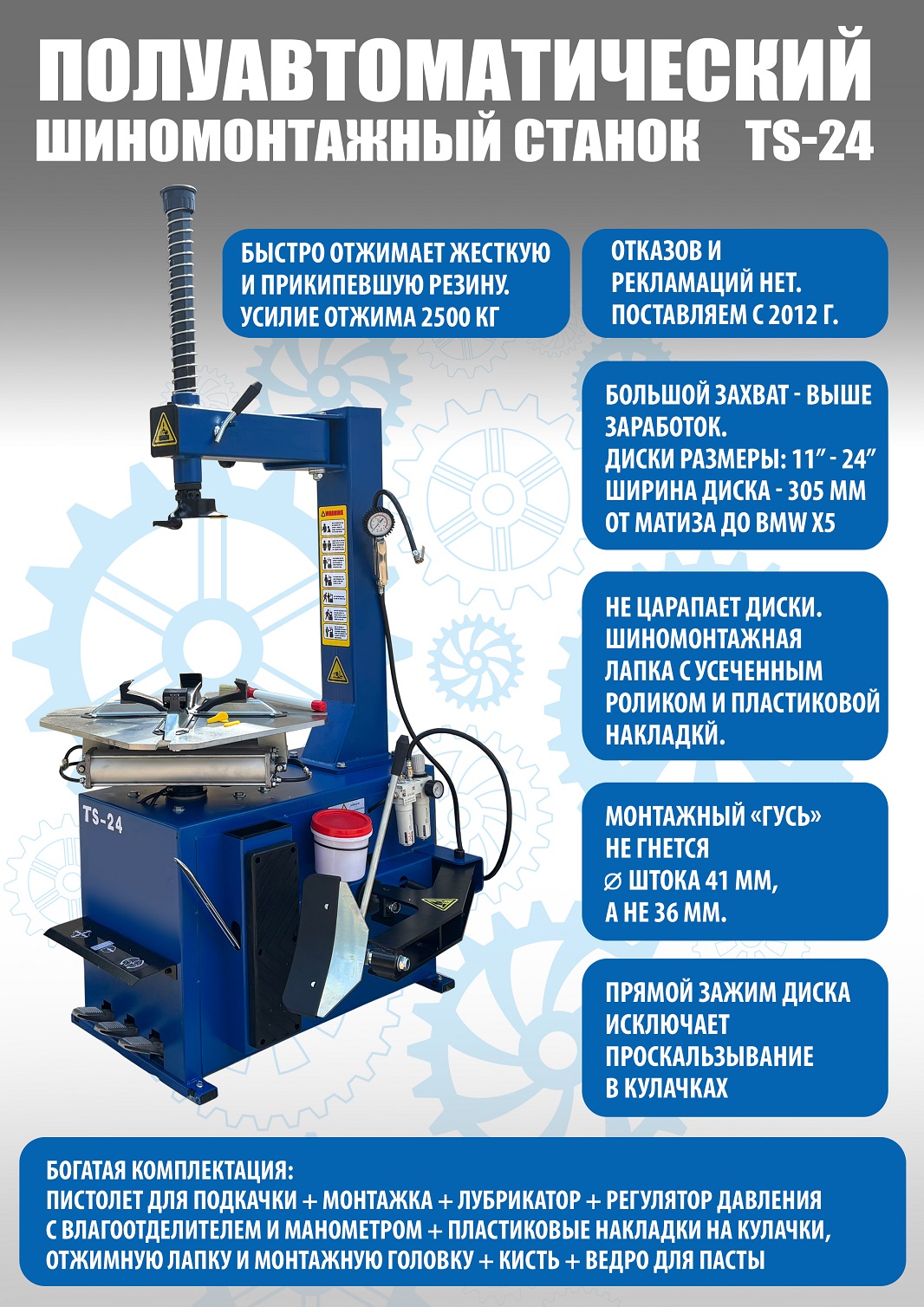 TS-24 шиномонтажный станок. Полуавтоматический. Квадратный стол. Рекомендуется для постов со средней и высокой проходимостью. Для дисков: внешний 11÷21”, внутренний 12÷24”.  Усилие отрыва покрышки 2700 кг. В комплекте: пистолет для подкачки шин + монтажка + пластиковые накладки на зажимные кулачки + регулятор давления с влагоотделителем и манометром. Поставляем на 220В и 380В.